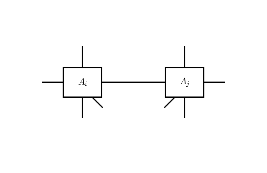 A two-body gate \(g_{ij} = e^{-\delta\tau\, h_{ij}}\) (with time step \(\delta\tau\)) is applied to each nearest-neighbour pair. Starting from two neighbouring site tensors \(A_i\) and \(A_j\):